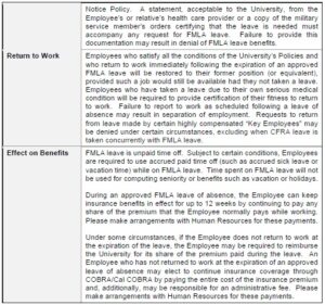 The duration of FMLA leave, the availability of insurance benefits, the opportunity for reinstatement, and other privileges associated with this leave are limited to the requirements of state and federal law. No express or implied contractual rights should be inferred from this Policy.