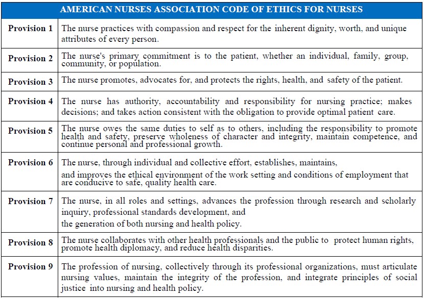 Source: American Nurses Association. (2015). Code of ethics with interpretative statements. Silver Spring, MD: Author. Retrieved from http://www.nursingworld.org/MainMenuCategories/EthicsStandards/CodeofEthicsforuNrses/Code-of- Ethics-For-Nurses.html